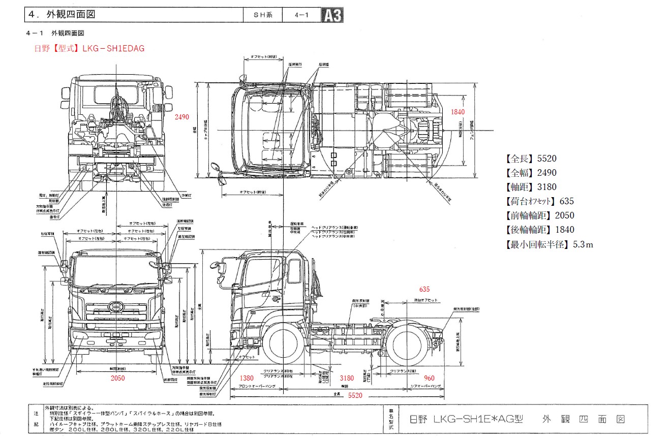 参考にしてみてください。PDF ⇒ 特車用外観図日野LKG-SH1EDAG