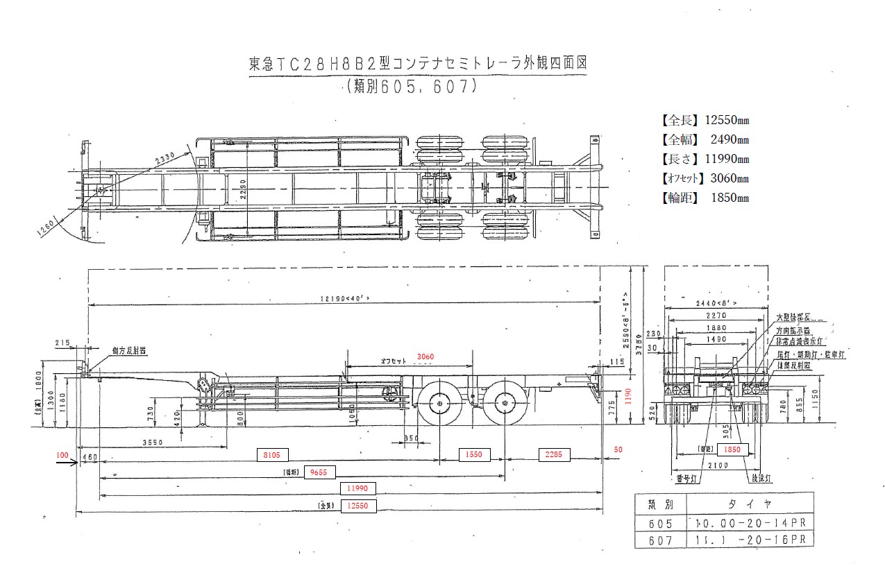 特車申請に必要な寸法を落とし込んだ40ft海上コンテナセミトレーラ【東急 TC28H8B2】の外観図です。